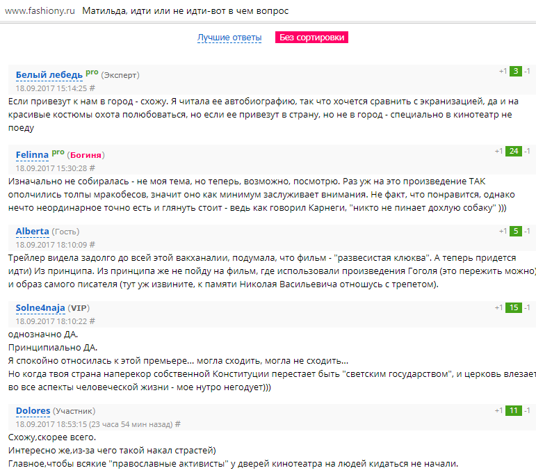 Скриншот обсуждения темы на далеком от политики и религии сайте Fashiony.ru, посвященном моде и стилю. «Матильда» добралась и сюда!..