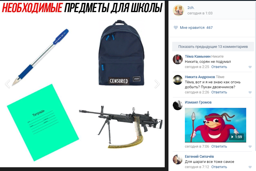 Интересно, что этот пост в одном из рассадников «черных» мемов был опубликован в 1.03 15 января, то есть ДО инцидента в пермской школе. Разумеется, это всего лишь совпадение