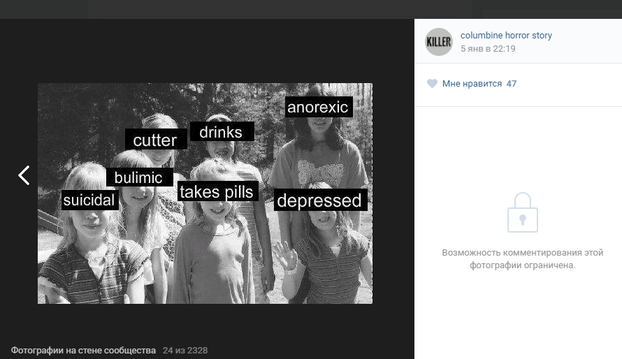 Показательно, что перепуганные пермские дети бросились за помощью в расположенный неподалеку торговый центр с говорящим названием «Кит». Это также случайное, хотя и знаковое совпадение, поневоле отсылающее к суицидальной «игре» «Синий кит», набравшей огромные обороты в том вКонтакте год назад, в двадцатых числах января 2017 г. Характерные для суицидальников мемы мелькают и в «колумбайновских» группах.