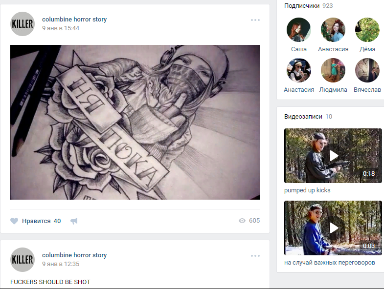 Значительно возросло общее число подписчиков этих сообществ (сейчас оно составляет как минимум 15 тысяч человек; в одном лишь наиболее крупном паблике «тупа колумбайн» состоит 5331 человек, тогда как в сентябре 2017 г. их было немногим более тысячи). При этом некоторые группы, оправдывающие и героизирующие колумбайновских убийц, в частности, «ERIC HARRIS & DYLAN KLEBOLD | COLUMBINE | 18+», перешли в режим частного сообщества. В отличие от обычных закрытых групп, в которые можно подать заявку, но принятие будет зависеть от решения администрации, в частных сообществах такой порядок вступления не предусмотрен: администрация сама рассылает приглашения тем, кто, по ее мнению, этого достоин. Таким образом, в социальной сети вКонтакте существуют группы, осуществляющие подбор и последующую «накачку» своих членов депрессивно-агрессивными идеями, далекими от идеалов поддержания правопорядка и стабильности в обществе, де-факто по «игиловской» схеме.