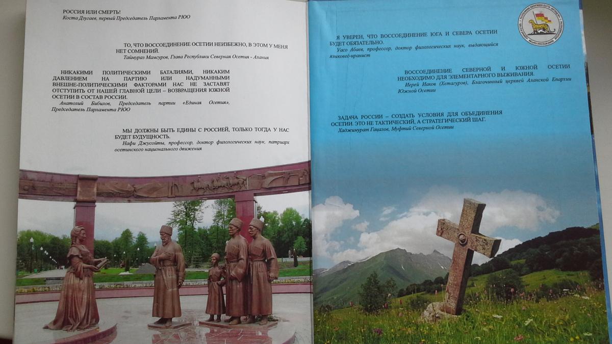 «Принятое решение о присоединении к России явилось закономерным шагом, на который руководство пошло, суммировав пройденный путь, тщательно проанализировав день сегодняшний, проведя все необходимые переговоры. Не было альтернативы, не оставили нам возможность выбирать», - разъясняет он, напоминая страшные детали спровоцированного Тбилиси грузино-осетинского конфликта: «сотни убитых, раненых, пропавших без вести, десятки тысяч изгнанных из мест своего проживания осетин создали «критическую массу», и в нашей общественно-политической мысли выкристаллизовалось решение: с Грузией нам не по пути».