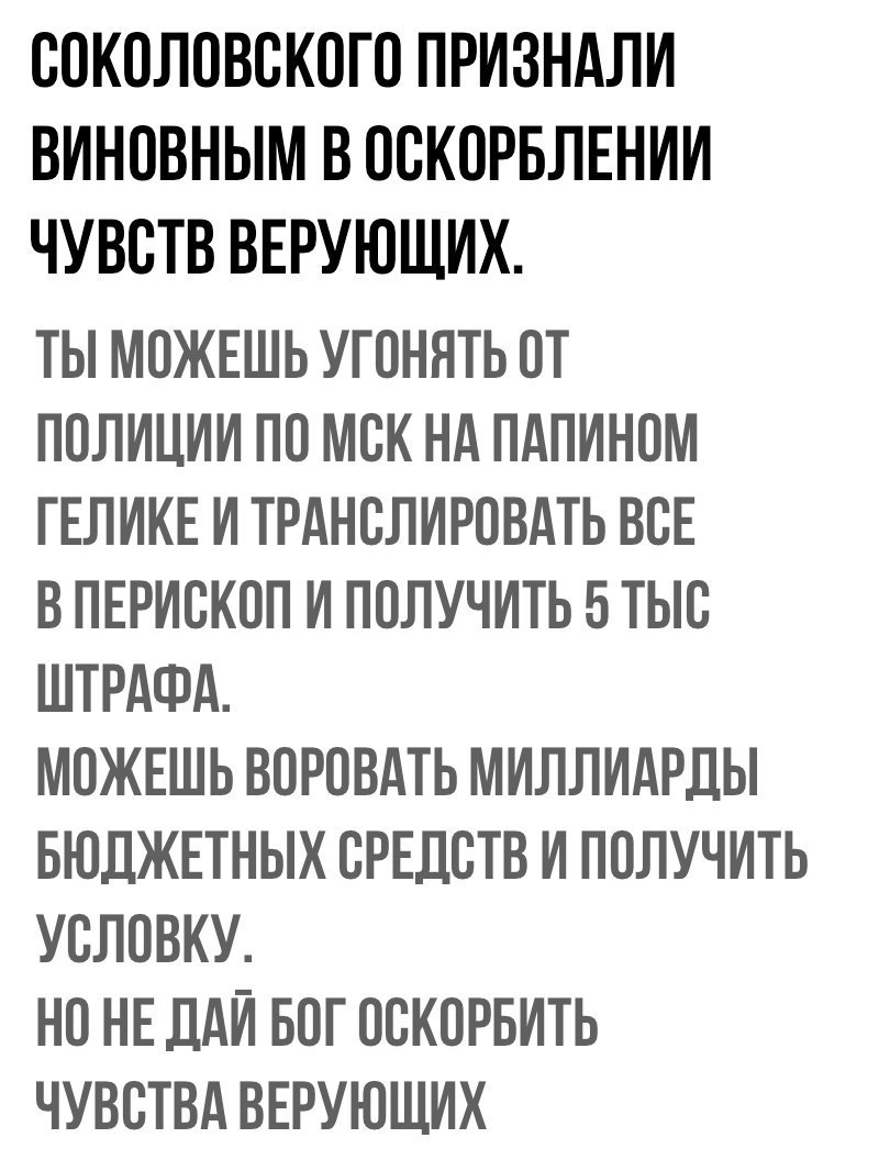 Скандальный видеоблогер, матерщинник (одно из его видео так и называется – «Я обожаю мат») и хам, создатель русского аналога «Шарли Эбдо», молодой (22 года) человек Руслан Соколовский получил за свою деятельность три с половиной года условно. Приговор, судя по поведению обвиняемого на суде и сразу после него, вряд ли является оптимальным: он не раскаялся – он только испугался. Судя по поддержке, которую оказывают ему правозащитники («Мемориал» объявил Соколовского политическим заключенным) и прочая либеральная общественность, этого гражданина, отделавшегося, к сожалению, лишь легким испугом, ожидает «большое будущее», даже несмотря на ограничения, накладываемые условным сроком.