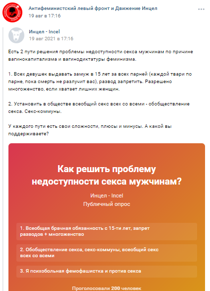 Репост в паблике Поднебесного Антифеминистский левый фронт и Движение Инцел из также основанного им, но заблокированного к тому времени сообщества Инцел - Incel от 19 августа 2021 г.
