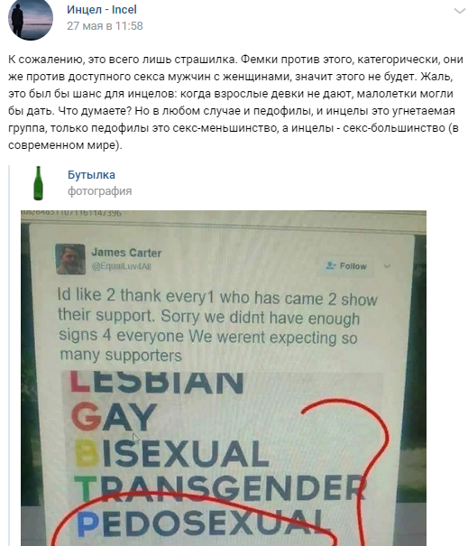 Солидарны с вождем и активисты других инцельских пабликов.